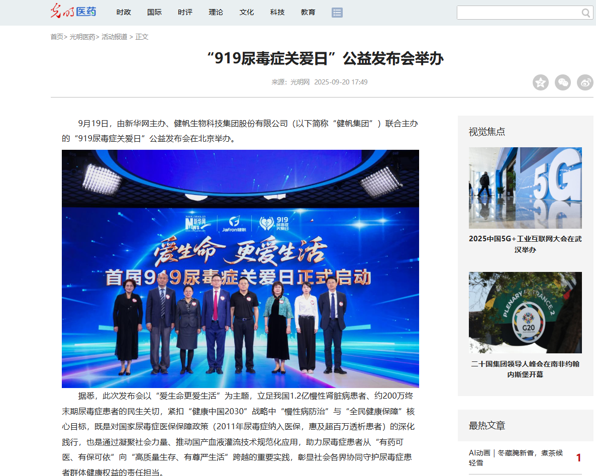 9月19日,由新華網(wǎng)主辦、健帆生物科技集團(tuán)股份有限公司(以下簡(jiǎn)稱“健帆集團(tuán)”)聯(lián)合主辦的“919尿毒癥關(guān)愛日”公益發(fā)布會(huì)在北京舉辦。